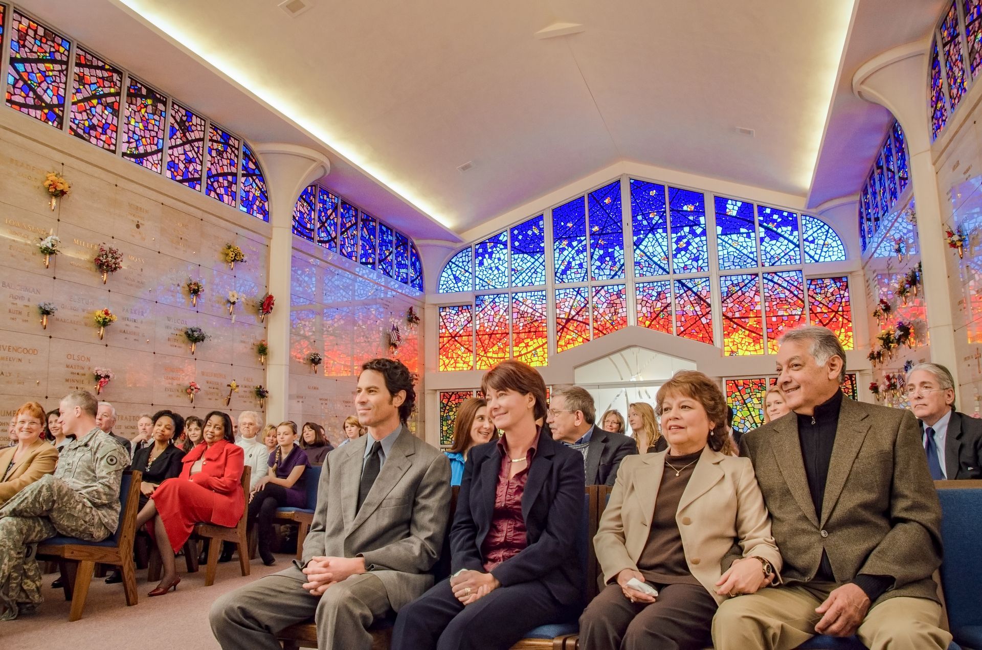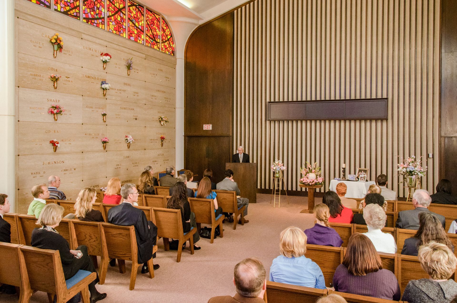The Private Family Chapel is located in the lower level of the mausoleum complex. The chapel walls contain niches for the placement of cremated remains. If inurnment is taking place in the Family Niche Room, use of the Private Family Chapel is free of charge.